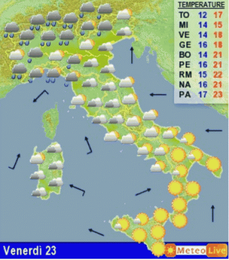 Venerdi 23 ottobre: peggiora al nord e sulla Toscana nell’arco della giornata con piogge e rovesci, ancora soleggiato altrove.
