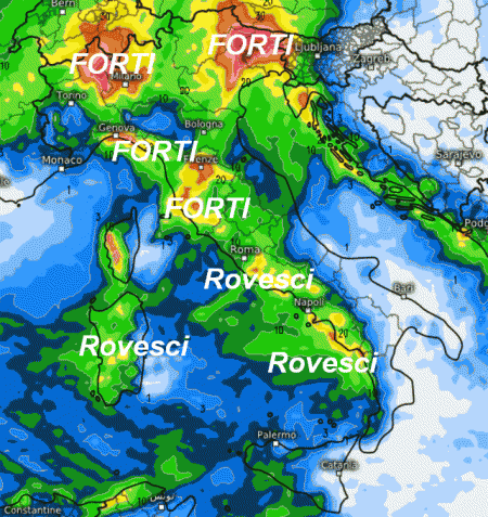 Saranno poche le regioni che si salveranno dalle grinfie di giove pluvio. I fenomeni più forti sono attesi al nord e lungo il Tirreno, mentre verranno interessate meno le regioni del medio-basso Adriatico e il meridione ad eccezione di Campania, Calabria Tirrenica e Sicilia.