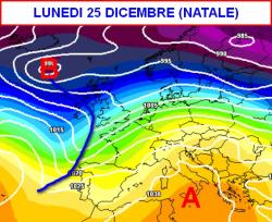 La giornata di Natale (seconda mappa) segnerà un cambiamento abbastanza importante di configurazione a scala emisferica: l’alta pressione si porterà al meridione, mentre le regioni settentrionali verranno interessate da un flusso umido da sud-ovest foriero già di qualche pioggia.