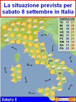 RIASSUMENDO: sabato 8 settembre ancora qualche temporale nelle zone interne del centro, del sud e in Adriatico specie nel pomeriggio, per il resto bel tempo.