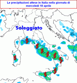 La prima mappa mostra le precipitazioni attese in Italia nel pomeriggio di mercoledi 18 aprile. Come si può notare, il rischio di temporali riguarderà la dorsale appenninica centro-meridionale e il versante tirrenico. Si tratterà di temporali essenzialmente pomeridiani, che tenderanno ad attenuarsi non appena si spegnerà la lampadina del sole.