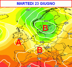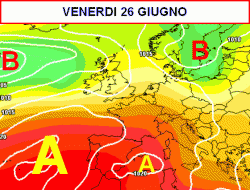 Si tratterà in sostanza dell’ultima sfuriata temporalesca prima della forte rimonta anticiclonica sopra citata, che inizierà a spingere a partire dalla giornata di venerdì 26 giugno (seconda cartina a lato).