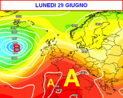 L’analisi prevista per l’ultimo lunedì di giugno (terza cartina a lato) inquadra l’alta pressione in posizione "di attacco" e pronta ad invadere gran parte del nostro continente nei giorni successivi.