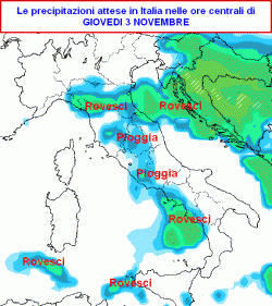 Tra mercoledi 2 e giovedì 3 novembre (la prima mappa si riferisce alle ore centrali di giovedì), un veloce impulso perturbato causerà un graduale aumento della nuvolosità sull’Italia; arriveranno anche alcune precipitazioni specie su Toscana, Umbria occidentale, Lazio e in tendenza sulla Campania e la Sicilia occidentale.