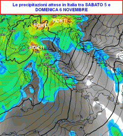 La seconda mappa si riferisce alla giornata di domenica 6 novembre e ci mostra piogge intense su Liguria, alta Toscana e fascia prealpina centro-orientale.