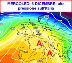 Mercoledi 6 dicembre la figura stabilizzante sarà in piena azione sull’Italia (prima mappa); in quota si prevede un lieve aumento termico, mentre gelate e nebbie si depositeranno sulle pianure e nelle valli incassate del centro specie di notte e al primo mattino.