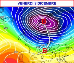Venerdì 8 dicembre: peggiora al nord-est e al centro con piogge, temporali e neve sulle Alpi, saltato il nord-ovest e fenomeni poco probabili anche sulla Sardegna e meridione. Ventoso e più freddo ovunque.