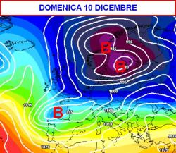 A partire dalla giornata di domenica 10 dicembre (terza mappa) la situazione tenderà a complicarsi ulteriormente stante l’arrivo di un nucleo freddo direttamente dall’Islanda.