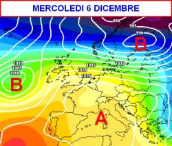 La prima mappa valida per mercoledi 6 dicembre mostra una vasta zona anticiclonica che abbraccerà gran parte del Continente, Italia compresa. Sulle pianure e le bassure faranno la ricomparsa nebbie anche fitte che manterranno basse le temperature di notte e al mattino.