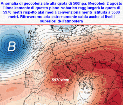L’apice del caldo verrà raggiunto nel corso della prossima settimana, le giornate della canicola avranno come "target", il periodo compreso tra lunedì 31 luglio e sabato 5 agosto. Le anomalie saranno assolutamente rilevanti; la quota di 500hpa che, secondo i libri di meteorologia, dovrebbe collocarsi pressappoco a 5500 metri, la ritroveremo invece alla ragguardevole altitudine di 5900 metri. La nostra troposfera, cioè la fascia atmosferica compresa tra il suolo ed i 12.000 di quota (per le nostre latitudini nel periodo estivo) verrà riempita per intero da masse d’aria calda che ne determineranno una espansione che andrà poi a ripercuotersi sull’intera colonna d’aria relativa proprio alla fascia troposferica.
