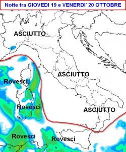 La prima mappa mostra la situazione attesa in Italia nella notte tra giovedì 19 e venerdì 20 ottobre; si notano i rovesci che interesseranno a macchia di leopardo la Sardegna, la Sicilia e a seguire forse le estreme regioni meridionali.