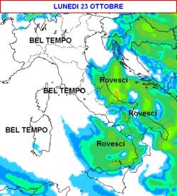Lunedi 23 ottobre: tempo molto instabile in Adriatico e al meridione con piogge sparse e rovesci, bel tempo altrove.
