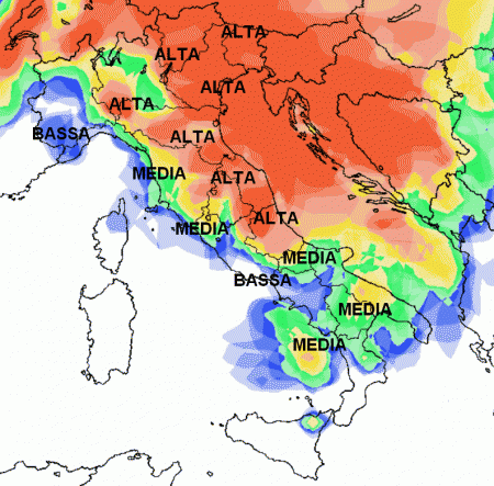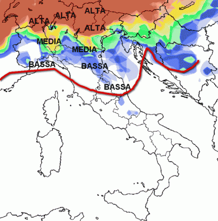 La probabilità di pioggia viene giudicata ALTA su Alpi, Prealpi e settori dell’alta pianura; MEDIA sulle pianure del nord, BASSA sulla Liguria e le aree interne del centro; su tutte le altre regioni la probabilità di pioggia viene al momento giudicata NULLA