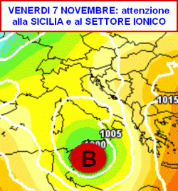La cartina sinottica riferita proprio alla giornata di venerdì 7 novembre, ci mostra un minimo di pressione abbastanza profondo posizionato nei pressi della Sicilia.
