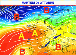 La cartina sinottica valida per la giornata di martedì 20 ottobre ci mostra un forte anticiclone posizionato con i suoi massimi tra il Regno Unito e la Francia settentrionale. Da notare il dominio delle depressioni a latitudini molto settentrionali e l’arrivo di aria più fresca da nord-est sull’Italia, che attiverà una depressione tra lo Ionio e la Grecia.