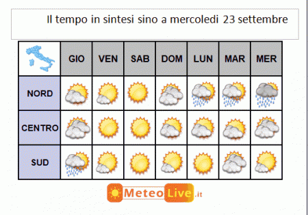 da lunedì 21 a mercoledì 23 settembre: al nord nuvolosità irregolare, a tratti più compatta con locali rovesci anche temporaleschi, più probabili da martedì e a ridosso dei rilievi, possibili anche in pianura da mercoledì. Al centro nubi sparse in un contesto a tratti soleggiato, locali rovesci da martedì su Toscana, Sardegna, poi anche Umbria, bel tempo altrove. Ulteriore lieve calo termico al nord, anche al centro, valori stazionari al sud.