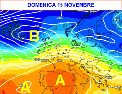 Le depressioni e le perturbazioni foriere di piogge e nevicate sui rilievi saranno ubicate ancora sul nord Europa, come dimostra la prima cartina valida per domenica 15 novembre.