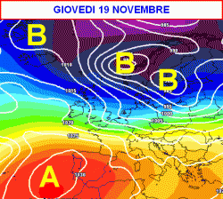 Da giovedì 19 (seconda cartina a lato), il flusso atlantico tenderà lentamente ad abbassarsi, interessando prima l’Europa centrale, poi anche il settentrione italiano.