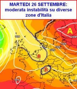 L’inizio della settimana prossima (la seconda mappa si riferisce alla giornata di martedì 26 settembre), mostra la presenza di diverse "gocce fredde" tra l’Europa centro-meridionale e l’Italia.