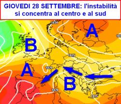Nella seconda parte della settimana (la terza mappa si riferisce alla giornata di giovedì 28 settembre), un lieve aumento della pressione sul bacino occidentale del Mediterraneo sposterà il baricentro dei fenomeni su parte del centro (segnatamente il settore adriatico) e il meridione.