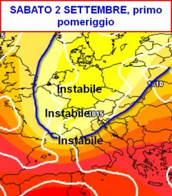 Venerdì 1 e sabato 2 settembre: tempo instabile al nord e al centro, specie lungo il Tirreno e le zone interne. Possibili temporali alternati a momenti di pausa. Più sole al sud e sulle Isole; temperature in calo al nord e al centro, ancora caldo al sud.
