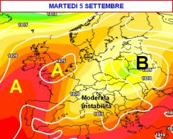 Cosa potrebbe succedere dopo la rottura? Andando a curiosare a metà della settimana prossima, in particolare tra martedì 5 e mercoledì 6 settembre (seconda mappa), notiamo la nostra Penisola ancora avvolta da una circolazione di bassa pressione con al suo interno un tempo moderatamente instabile.