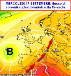 Mercoledì 17 settembre lieve peggioramento al nord e sulla Toscana con qualche pioggia, per il resto bel tempo e abbastanza caldo al meridione.