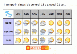mercoledì 20 settembre e giovedì 21 settembre: persistenza di una lieve variabilità in Adriatico e al sud con isolati rovesci, ancora ventilato e fresco, specie di notte e al mattino, quando le temperature risulteranno sotto la media del periodo.
