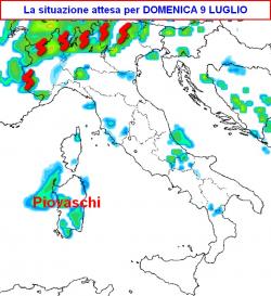 Domenica 9 luglio temporali maggiormente organizzati su Alpi, Prealpi e zone di pianura limitrofe; qualche piovasco anche in Sardegna, per il resto bel tempo e molto caldo.