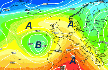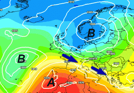 Notate la spinta dell’alta pressione che scaturirà da un affossamento di una depressione sul vicino Atlantico. Il flusso diverrà nord-occidentale sull’Italia (frecce blu), determinando rovesci soprattutto sulle Alpi e in misura minore nelle aree interne appenniniche.