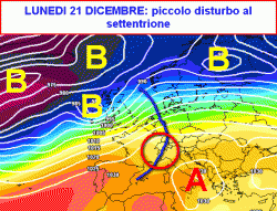 La seconda cartina valida per la giornata di lunedì 21 dicembre, ci mostra uno di questi disturbi. La coda di una perturbazione si limiterà a "toccare" il settentrione e parte del centro con qualche precipitazione, un po’ di vento, in un contesto sempre abbastanza mite.