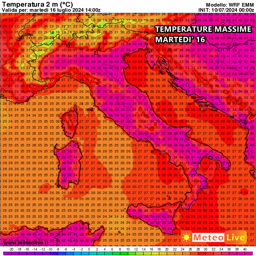 Martedì 16 Luglio: nessuna variazione. Caldo che si accentua ancor di più stante l’aumento dell’umidità. Eloquenti le temperature massime previste martedì 16: