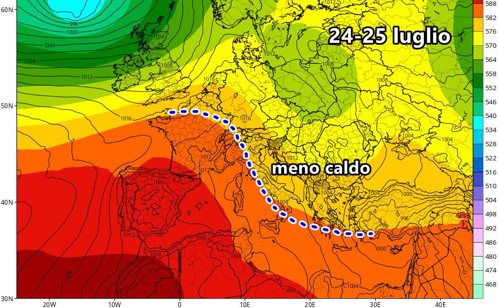 Discorso diverso per metà settimana, tra 24 e 25 Luglio, quando approderà aria ancor più fresca che porterà le temperature quantomeno attorno alle medie del periodo.