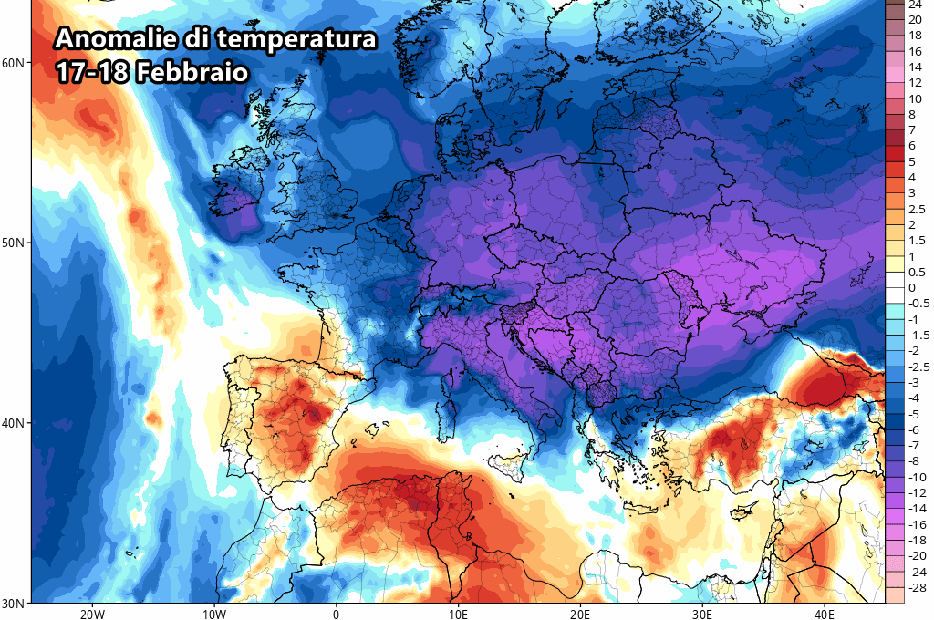 Lunedì 17 Febbraio: aria gelida da nord-est, possibili nevicate anche su pianure e coste, ma isolate, specie sul versante adriatico (da confermare).