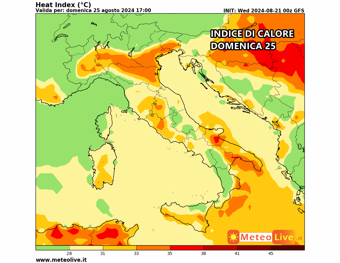 Nei prossimi giorni il caldo sarà ancora protagonista, ma questa volta non raggiungerà i livelli estremi delle ultime settimane. Il promontorio africano, infatti, non sarà particolarmente coriaceo e non sarà sostenuto da masse d’aria estremamente calde tropicali. Nonostante questo, potremo comunque percepire l’immancabile calura su tante nostre regioni, specie nel week-end. Nella mappa seguente, infatti, possiamo notare il moderato indice di disagio (in arancione) legato al mix tra temperature alte e umidità.