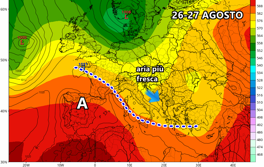 Lunedì 26 Agosto: possibile veloce irruzione fresca. Temporali e piogge sparse al nord e zone interne del centro. Meglio altrove. Temperature in lieve calo.