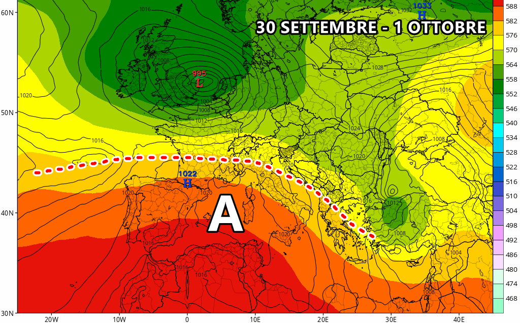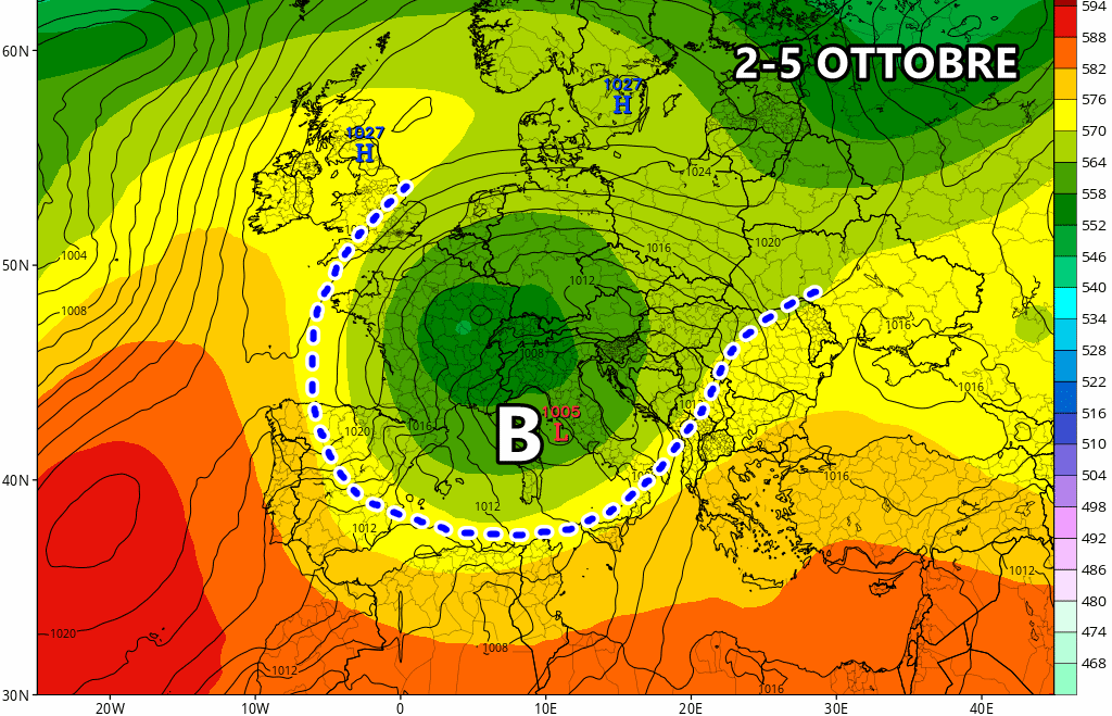 Mercoledì 2 Ottobre: fiume d’aria fresca dal nord Atlantico verso il Mediterraneo. Tempo in peggioramento su tutto il centro ed il nord.