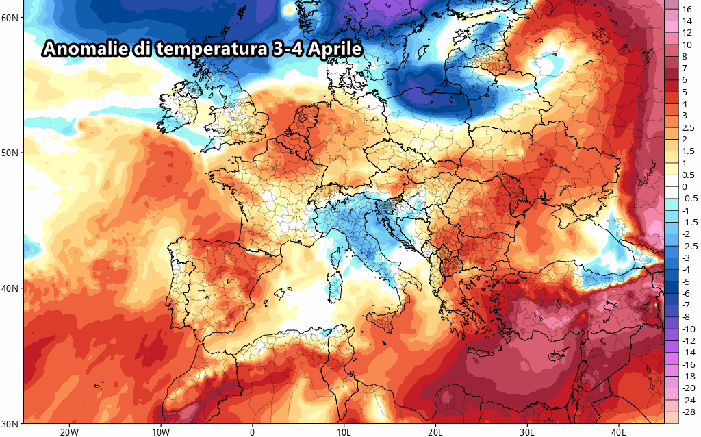 Passata questa ondata di maltempo, responsabile anche dell’avvezione calda subtropicale, sul meridione avremo un calo consistente delle temperature grazie all’arrivo di aria più fresca da ovest. Tra il 2 e il 4 Aprile ci aspettiamo un sensibile calo termico su tutta Italia, anche di oltre 10 o addirittura 12 ° su tutto lo stivale. Questo calo termico sarà determinante per rientrare quantomeno nelle medie del periodo e, per quanto riguarda il Centro-Nord, scendere di un paio di gradi al di sotto di queste medie.