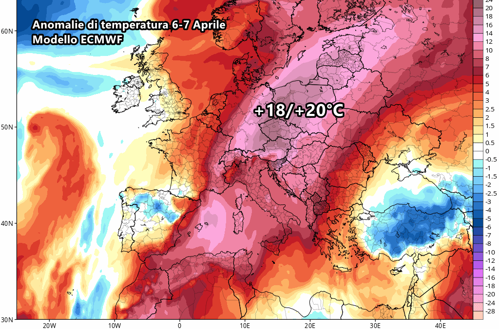 Il promontorio subtropicale potrebbe estendersi su tutta Italia e fiondarsi addirittura sull’Europa centro-orientale, determinando un nuovo clamoroso aumento delle temperature con valori da record su vaste aree dell’Europa centrale ma anche sulla nostra penisola. Davvero impressionanti le anomalie previste dal modello europeo ECMWF, che ci mostra temperature di almeno 18 o 20 ° superiori alle tipiche medie stagionali su tanti territori dell’Europa centrale.