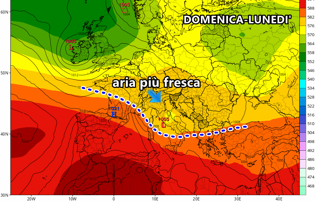 Un nucleo di aria fresca proveniente dal nord Atlantico potrebbe farsi largo sull’Europa centrale per poi attraversare l’Italia da nord a sud, costringendo l’anticiclone africano a indietreggiare verso le proprie latitudini d’origine. Questa avvezione di aria più fresca potrebbe interessare il nord già durante il weekend, soprattutto nella giornata di domenica, apportando anche acquazzoni e locali violenti temporali.