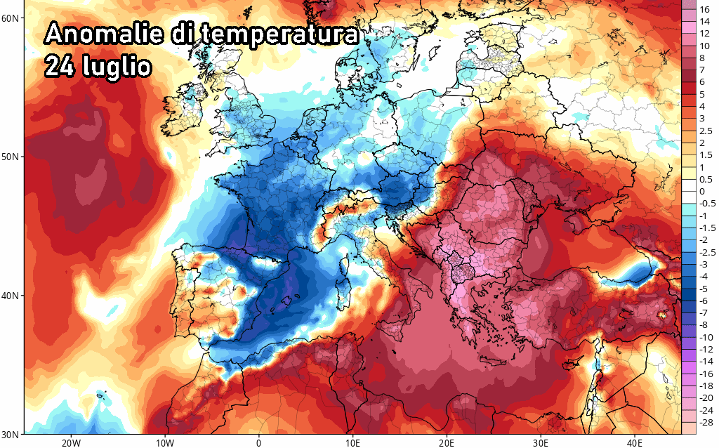 Nel frattempo, il Nord vedrà il passaggio di qualche forte temporale tra sabato, domenica, lunedì e martedì: saranno temporali isolati ma localmente forti, che interesseranno soprattutto Alpi, Prealpi e alte pianure della Val Padana, soprattutto tra Lombardia e Piemonte. Questi forti temporali potrebbero dar luogo a improvvisi nubifragi o grandinate con chicchi grossi, ma sarà solo un assaggio della possibile forte ondata di maltempo che andrebbe in scena da mercoledì 23 luglio.