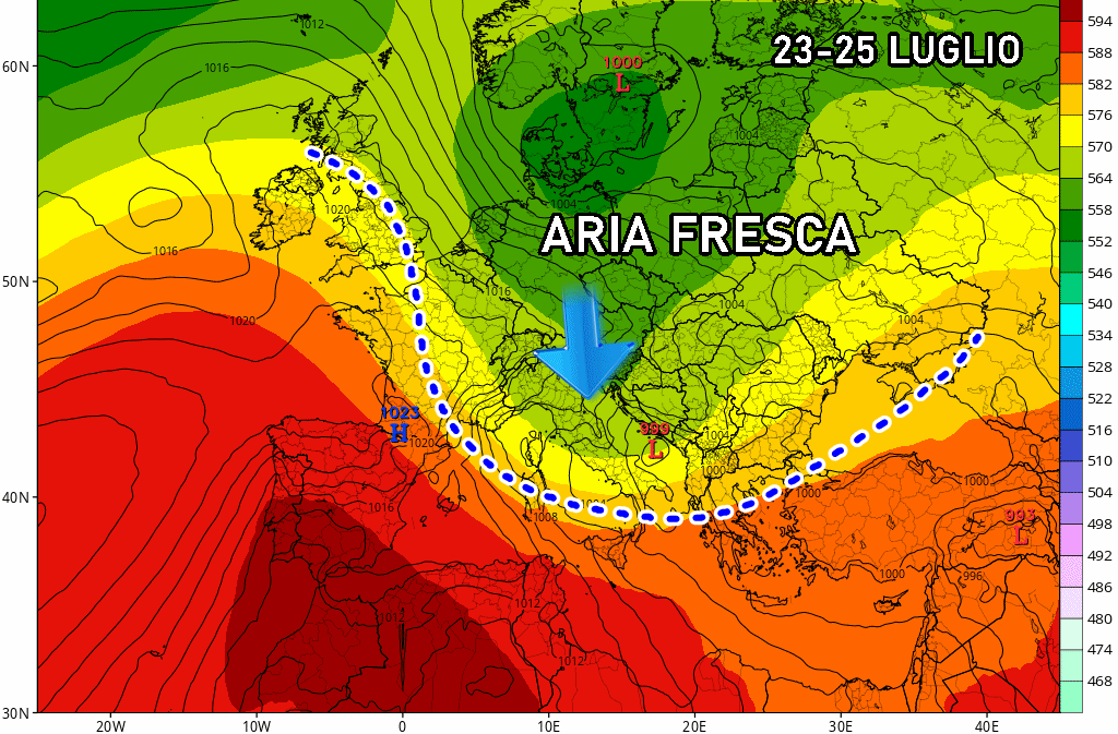 Il grande caldo subtropicale potrebbe essere finalmente spazzato via dal Mediterraneo da una imponente saccatura fresca, ora inquadrata da tutti i principali centri di calcolo. Mercoledì 23 luglio questa irruzione fresca potrebbe avvolgere il Nord, causando un forte calo termico e tanto maltempo, mentre sul resto d’Italia il caldo resisterà. Per un calo termico generale bisognerà aspettare il 24 o addirittura il 25 luglio, ma quantomeno si intravede una data di svolta dopo giorni e giorni di caldo estremo.