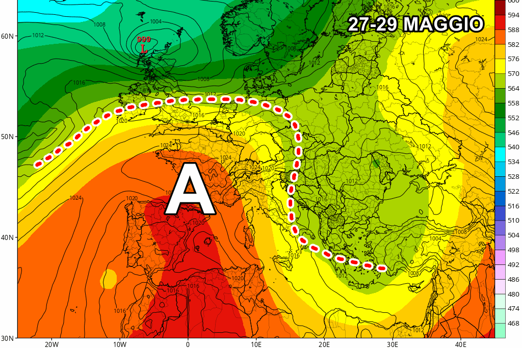 Netto cambiamento dal 27 maggio in poi! Da metà settimana l’alta pressione inizierà a spingere con forza su tutta l’Europa occidentale, pronta a dirigersi sull’Italia. Il nord e le regioni tirreniche rivedranno la stabilità ed un consistente aumento delle temperature, mentre la tramontana continuerà a soffiare al sud mantenendo le temperature più basse rispetto al nord.