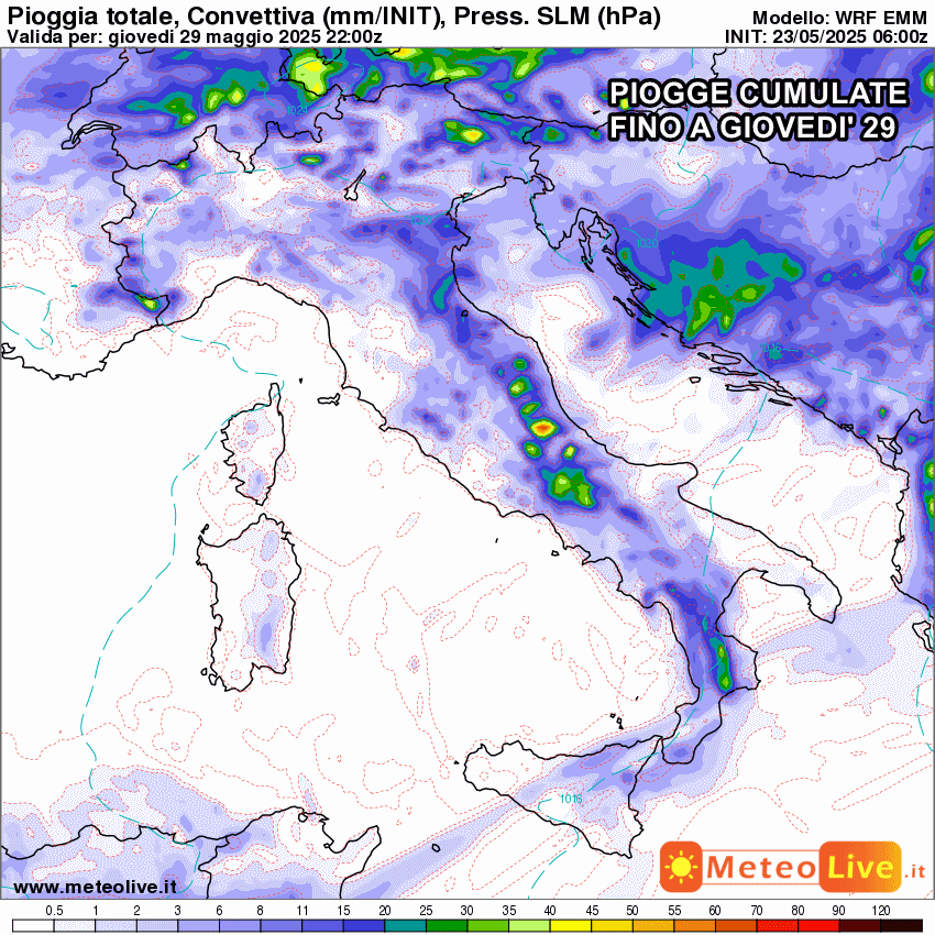 Di seguito le piogge previste fino al 29 Maggio, decisamente poco organizzate, concentrate perlopiù nei settori interni.