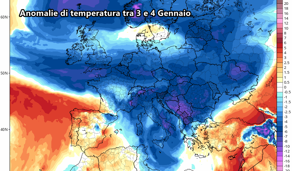 Le anomalie di temperatura previste tra 3 e 4 Gennaio ci fanno capire chiaramente come l’Europa sembra destinata ad un lungo periodo freddo, grazie alla discesa del fronte polare con un grosso carico d’aria fredda che andrà a consolidarsi su mezza Europa.