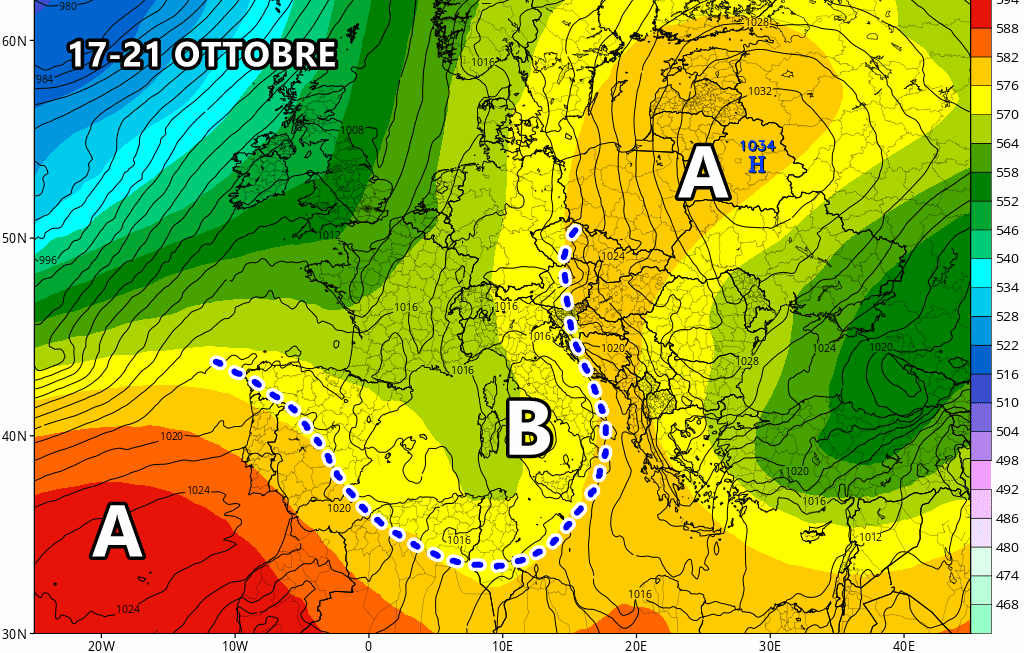 Giovedì 17 Ottobre: netto guasto al nord e medio-alto Tirreno. Nubi al sud senza fenomeni rilevanti.