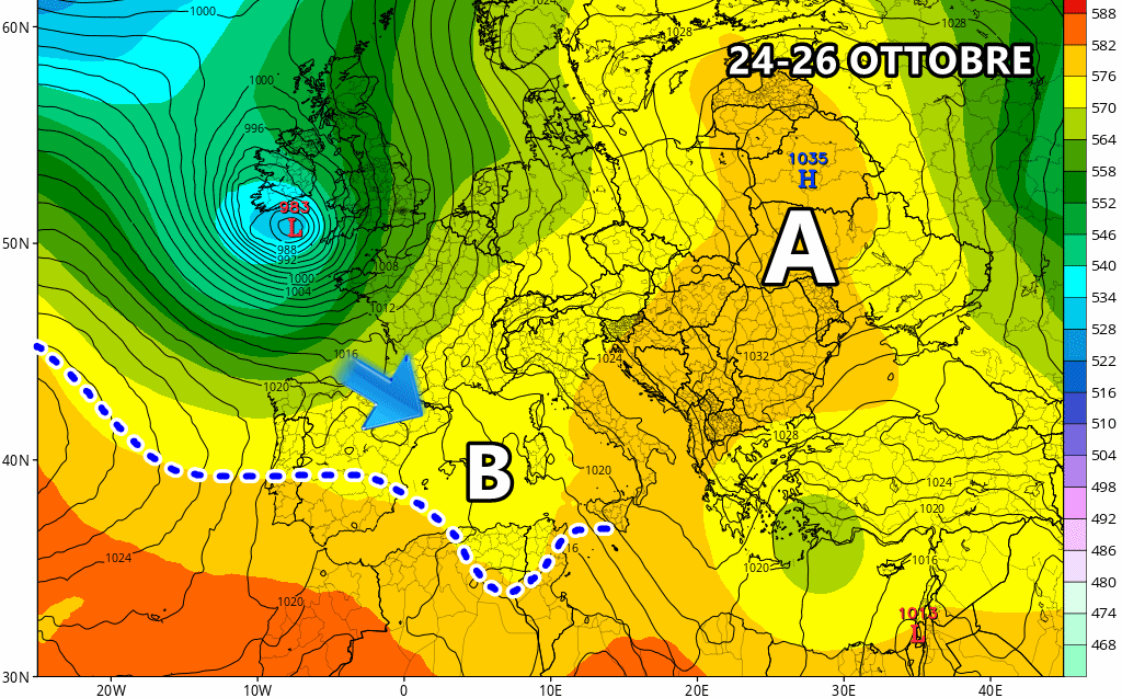 Mercoledì 23 Ottobre: alta pressione molto debole, possibili intrusioni fresche in alta quota verso il sud e le isole maggiori. Ancora rischio piogge su Sardegna e Sicilia!