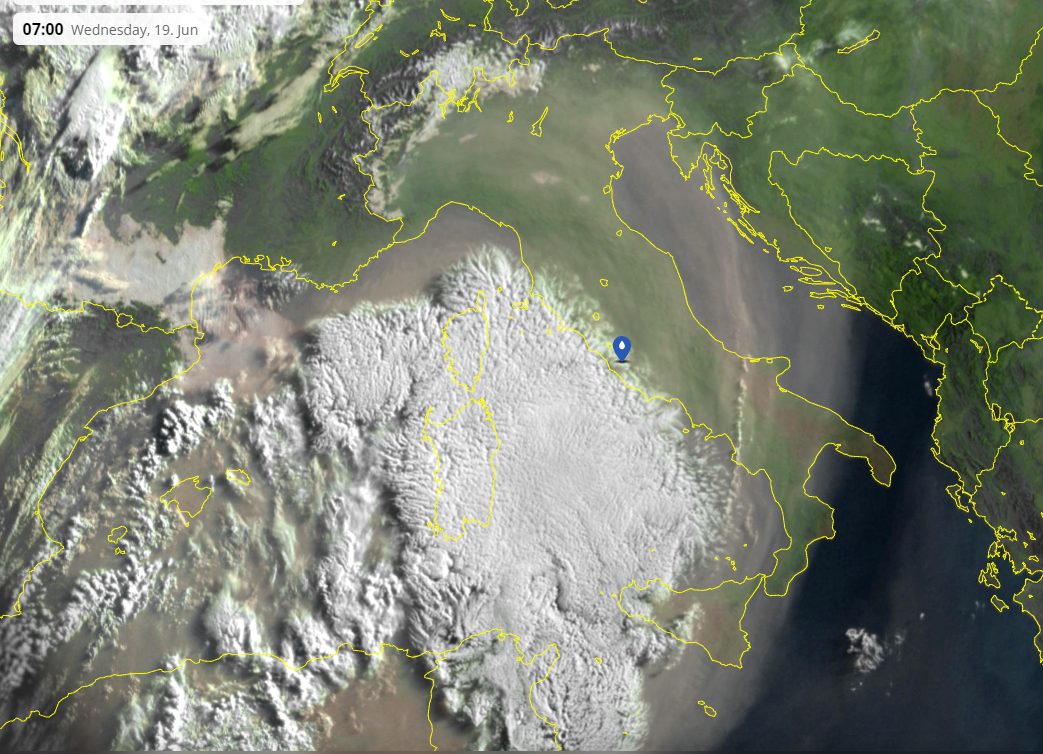 Il caldo africano continua ad intensificarsi ora dopo ora su tutta la nostra penisola, grazie al rinforzo di un vasto promontorio di alta pressione all’interno del Mediterraneo. Oltre al gran caldo, troviamo anche un flusso colmo di polvere desertica che sta avvolgendo in queste ore quasi tutta Italia, rendendo i nostri cieli sporchi e lattiginosi. Si tratta della tipica warm conveyor belt legata alle profonde depressioni atlantiche: questi caldi flussi subtropicali, nel momento in cui si intersecano con il Mediterraneo, danno sfogo a queste risalite di aria desertica colme di polvere sospesa alle alte quote. Si tratta di una massa d’aria relativamente secca, pertanto non ci sono piogge o temporali bensì solo polvere, qualche addensamento medio-alto e nulla più.
