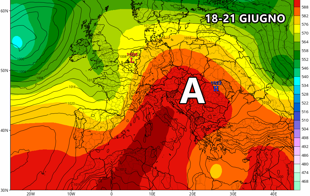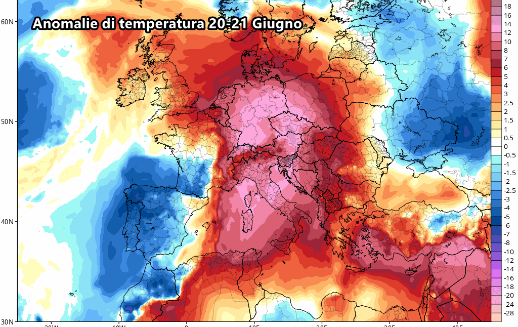 Clamorose le anomalie previste tra 20 e 21 Giugno non solo in Italia ma anche sull’Europa centrale (fino a 14°C oltre le medie del periodo):