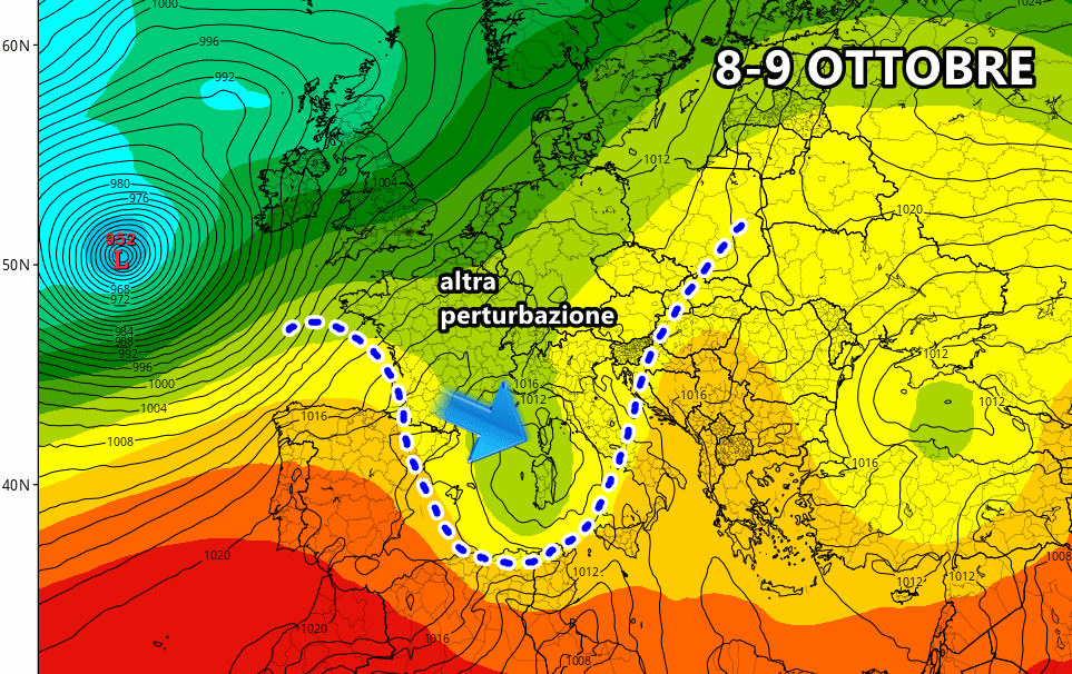 Dopo una breve pausa tra lunedì e martedì mattina, diventa sempre più probabile il passaggio di un’altra perturbazione atlantica, più veloce della precedente. Occorrerà, dunque, nuovamente l’ombrello tra 8 e 9 Ottobre, prima al nord, poi anche su centro e sud.